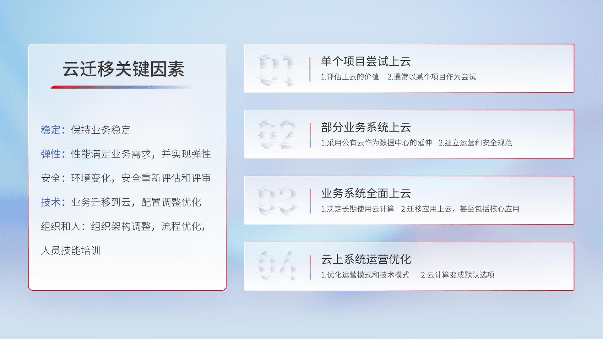结合实际业务,,,从规划设计、、云平台选型、、、、云原生改造、、、、数据迁移、、集成交付,,,迁移全过程为客户识别最佳上云路径,,,做好风险识别管理,,,,设计网络架构、、身份权限、、安全审计合规、、、操作审计、、、日志审计、、、、监控告警策略、、、多站点容灾设计等,,,对云上基础设施进行整体规划,,,提升IT治理水平,,,,以满足弹性、、、高可用、、高性能的需求。。